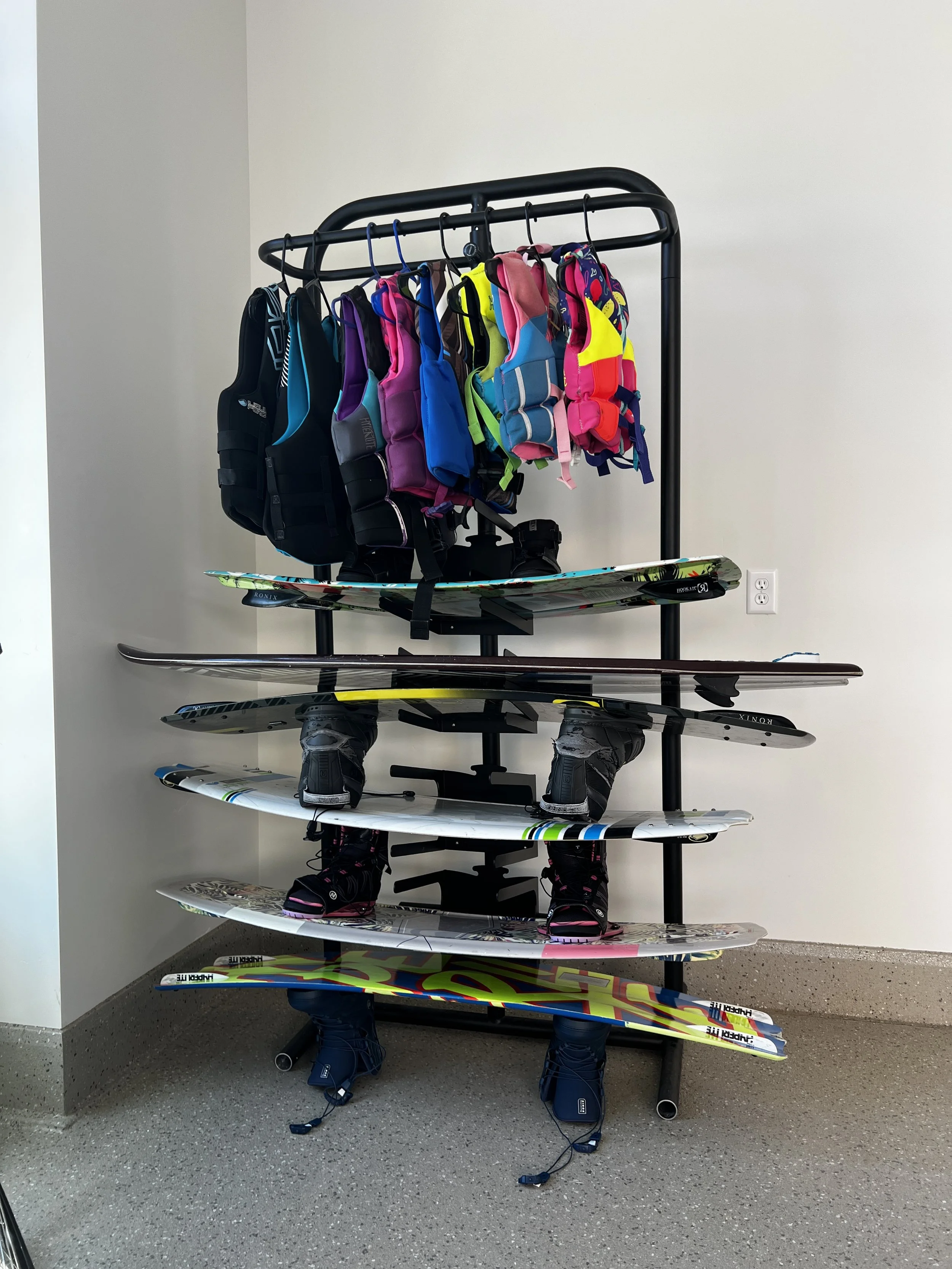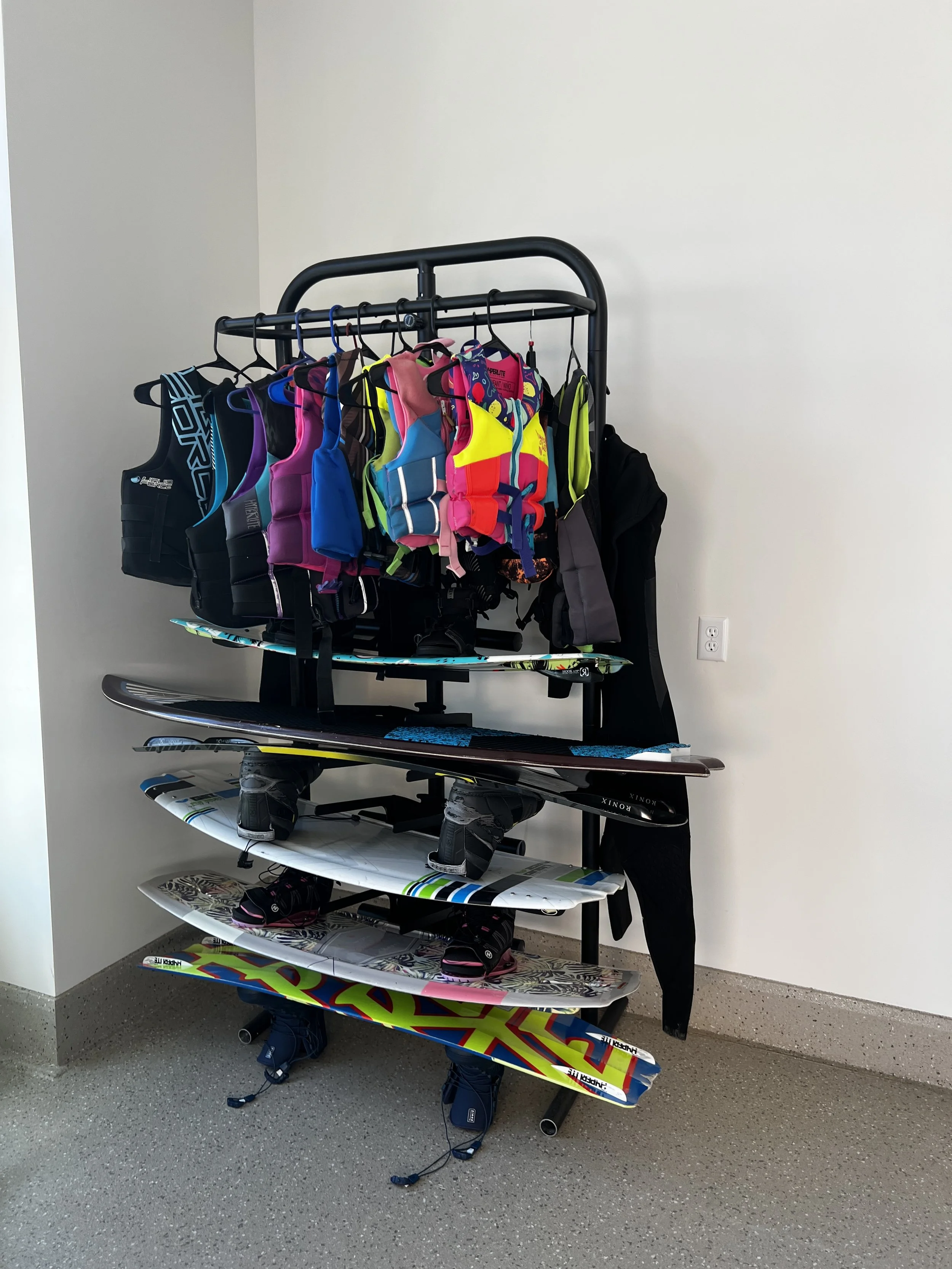 Piles of tangled life jackets, wetsuits, and boards cluttering the garage or dock